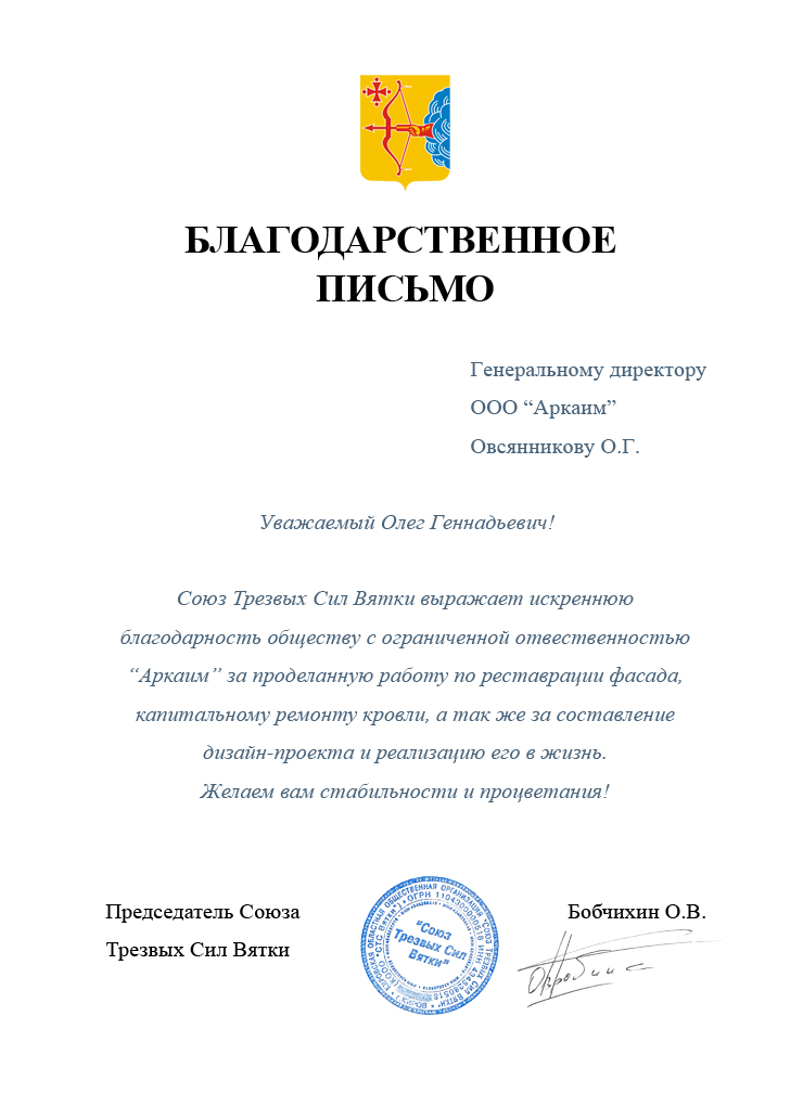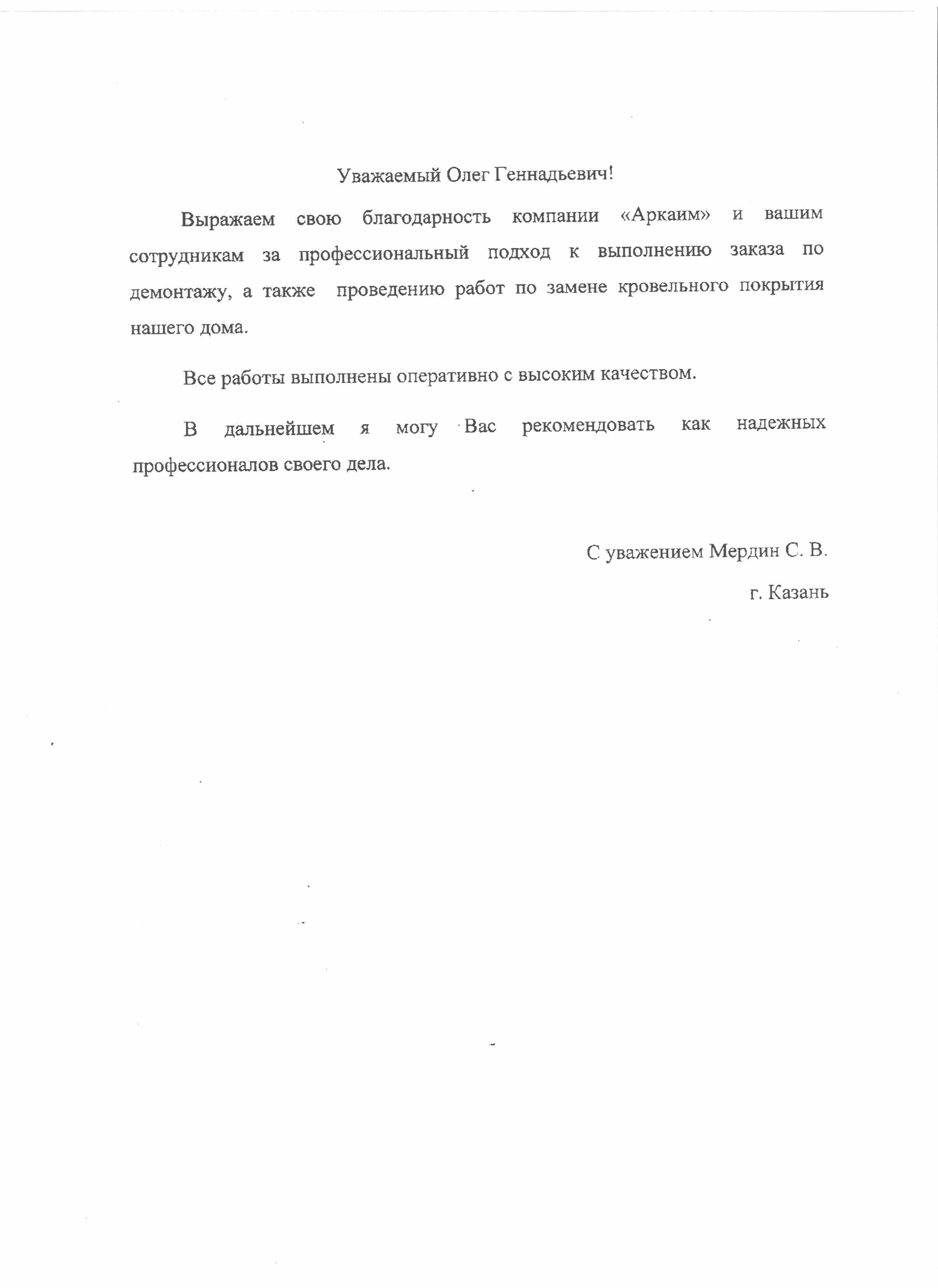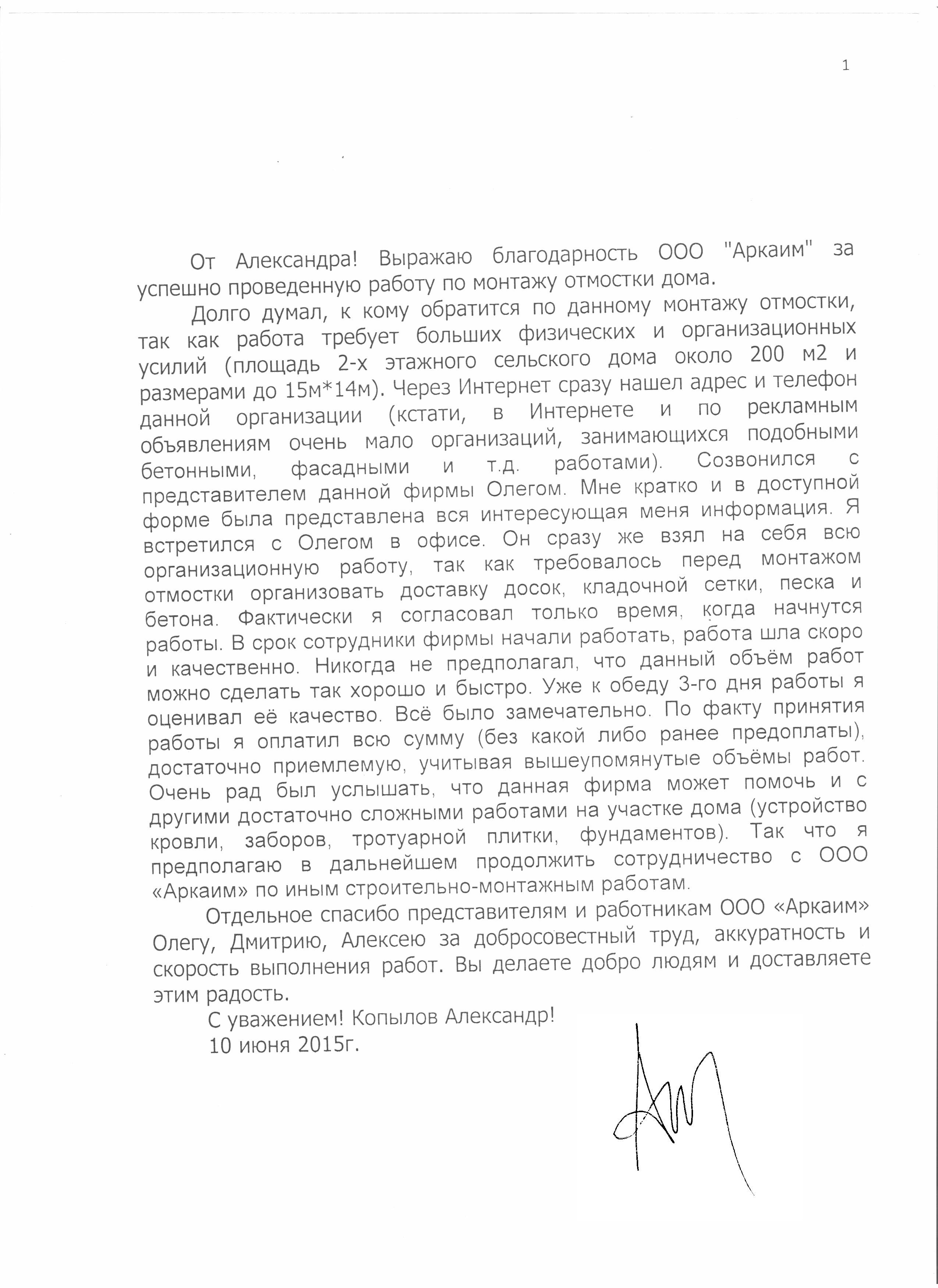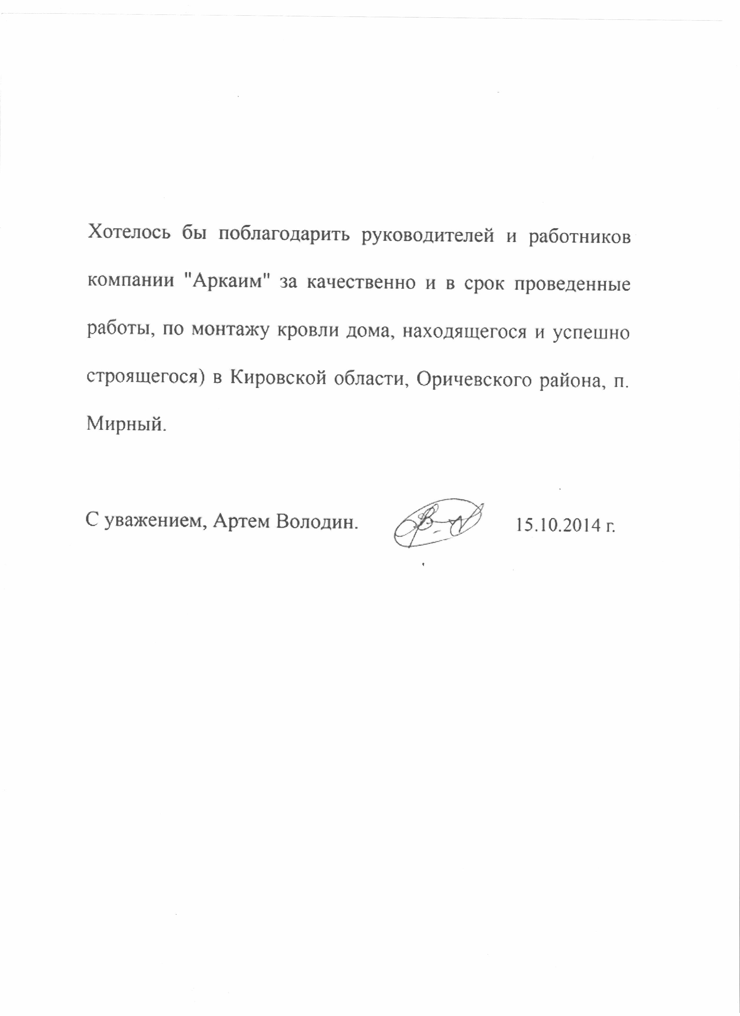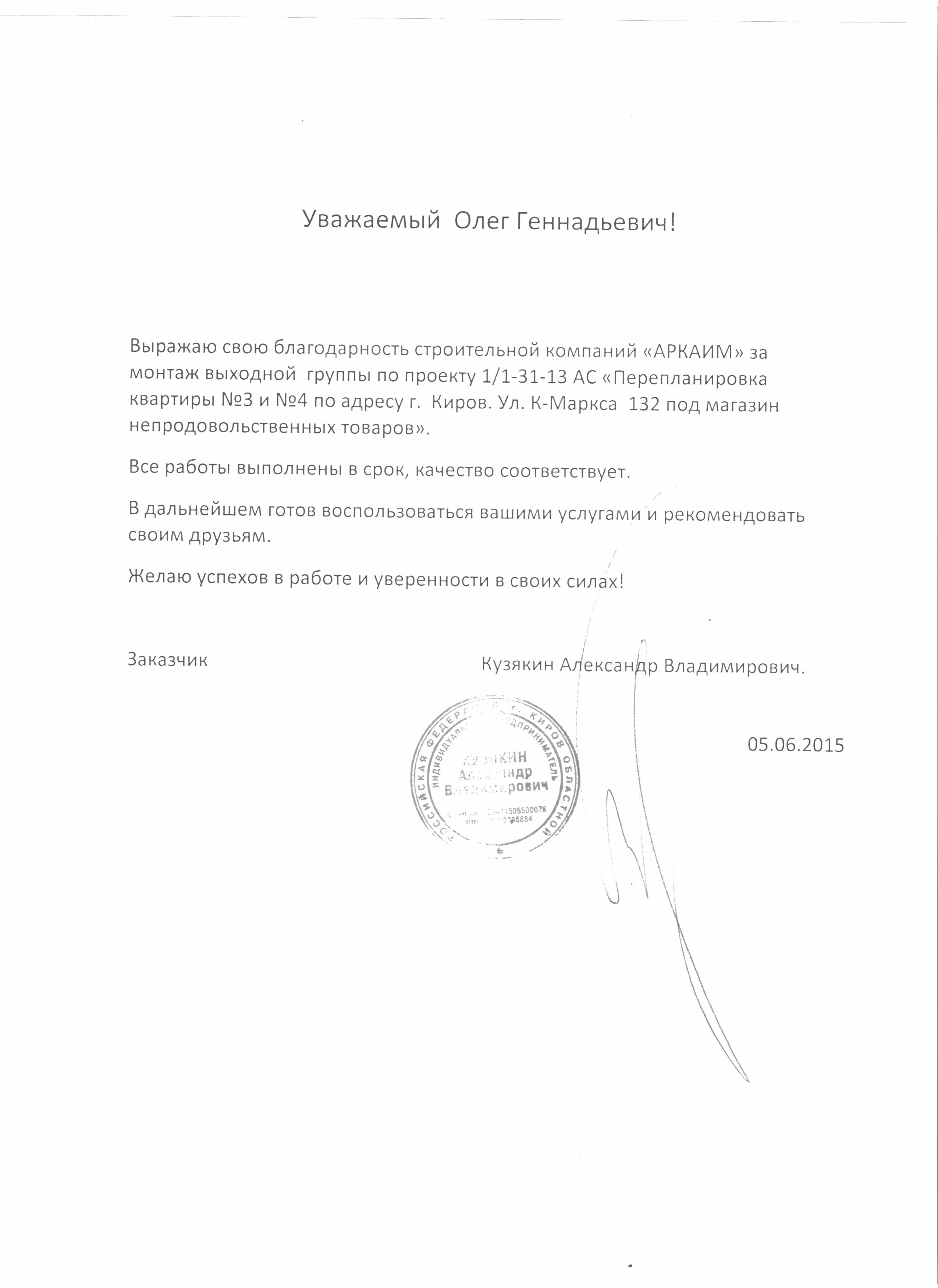 Выражаю благодарность сотрудникам и работникам ООО "Аркаим" за успешно проведенный ремонт помещений в сжатые сроки, в том числе работу в новогодние каникулы. Отдельное спасибо Александру за, можно сказать, работу на иснос, аккуратность и скорость выполнения работ. А так же Олегу и Александру за радение и участие в скорейшем завершении ремонта. В очередной раз убедился, что хорошо дешево не бывает. Поэтому при выборе бригады работников, советую прислушиваться к мнению Олега Геннадьевича. С уважением, директор ООО "Пунга" Сметанин Антон Борисович.