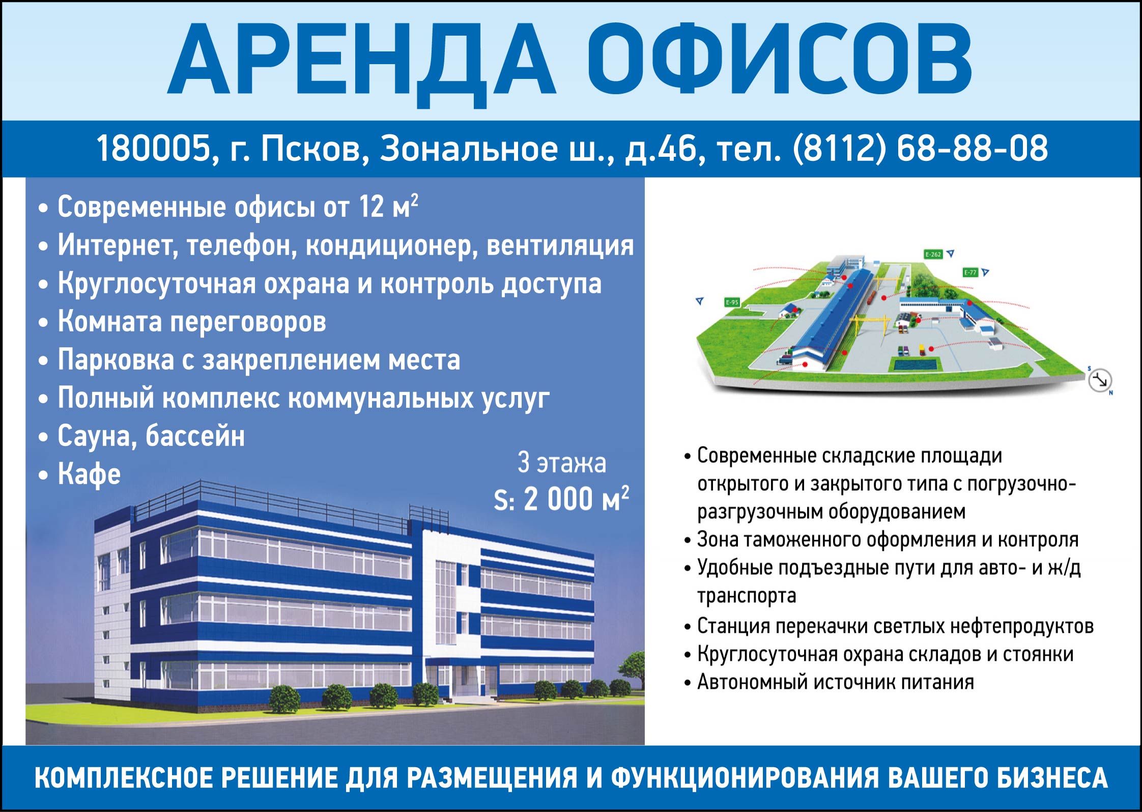 Добрый день! Деловой центр расположен по адресу: 180005, Псковская область, г.Псков, Зональное шоссе, д.46. Мы предлагаем комплексное решение проблемы размещения и функционирования Вашего бизнеса – размещение административно-управленческого персонала в новейшем ультрасовременном офисном центре и одновременное использование высококлассных складских помещений, услуг по погрузке, разгрузке и перевалке грузов, таможенно-логистических услуг. Территория многофункционального делового центра составляет более 73 000 квадратных метров – вся территория находится под круглосуточной охраной. Деловой центр находится вблизи автомобильных трасс E77, E95, E262 на пересечении 8 грузовых маршрутов. На данной территории расположен новейший офисный центр, складские помещения, склад временного хранения “Элком-Терминал” и зона таможенного оформления и контроля: - На территории находится открытая площадка на 300 ж/д контейнеров; - Оборудованы охраняемые площадки для открытого (уличного) хранения грузов; - Оборудована охраняемая стоянка; - Площадь закрытых складских помещений, оборудованных новейшим современным оснащением, стеллажами, холодильными камерами, системой пожаротушения, автономной системой отопления составляет более 7000 квадратных метров; - Организована система таможенного оформления грузов с использованием возможностей склада временного хранения “Элком-Терминал” и Таможенного поста «Псковский» ОТО и ТК №3, осуществляющего приём и очистку грузов в зоне таможенного контроля; - На территории комплекса имеются помещения для проведения фитосанитарного и ветеринарного контроля; - Удобные подъездные пути, в том числе для грузового крупнотоннажного транспорта и железнодорожного транспорта; - На территории делового центра имеется собственная железнодорожная ветка, сообщающаяся с Октябрьской железной дорогой, расположенная рядом с узловой станцией Берёзки. - На территории имеется станция перекачки светлых нефтепродуктов - Для бесперебойного обеспечения электричеством имеется собственный резервный автономной источник питания - Наличие современного складского погрузочно-разгрузочного оборудования от 1.5 до 45 тн, включая погрузчик контейнеров - Для осуществления погрузочно-разгрузочных работ используются 2 козловых крана Только для Вac единственный в своем роде и уникальный для города Пскова деловой центр - Три этажа новейших комфортных помещений; - Более 2 000 квадратных метров арендуемых площадей; - В наличии помещения от 12 квадратных метров; - Деловой центр обслуживается крупнейшими провайдерами в г.Пскове: ОАО «Ростелеком» и «Псковский ГТС», предоставляющие широкополосный доступ к сети Интернет и услуги телефонной связи. В здании делового центра построены локальные компьютерные сети с высокой пропускной способностью по технологиям Fast Ethernet, Gigabit Ethernet - В здании делового центра организована система контроля доступа, предусмотрена круглосуточная охрана - Организована большая стоянка перед зданием делового центра, с возможностью закрепления постоянного парковочного места. - Все помещения оборудованы приточно-вытяжной вентиляцией системой Systemair и кондиционерами - Наличие собственного кафе на территории делового центра; - Наличие рекреационных объектов на территории делового центра - сауны с бассейном и комнаты переговоров; - 