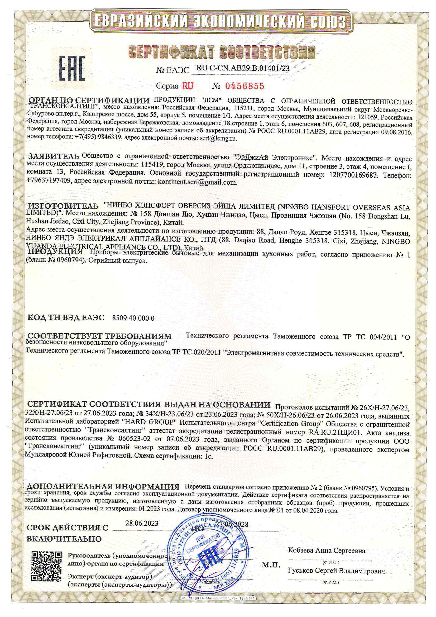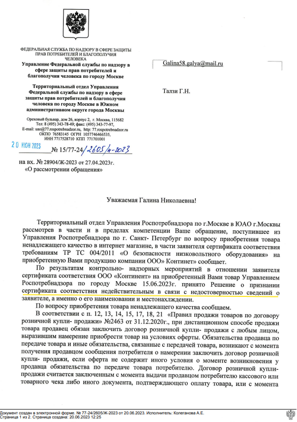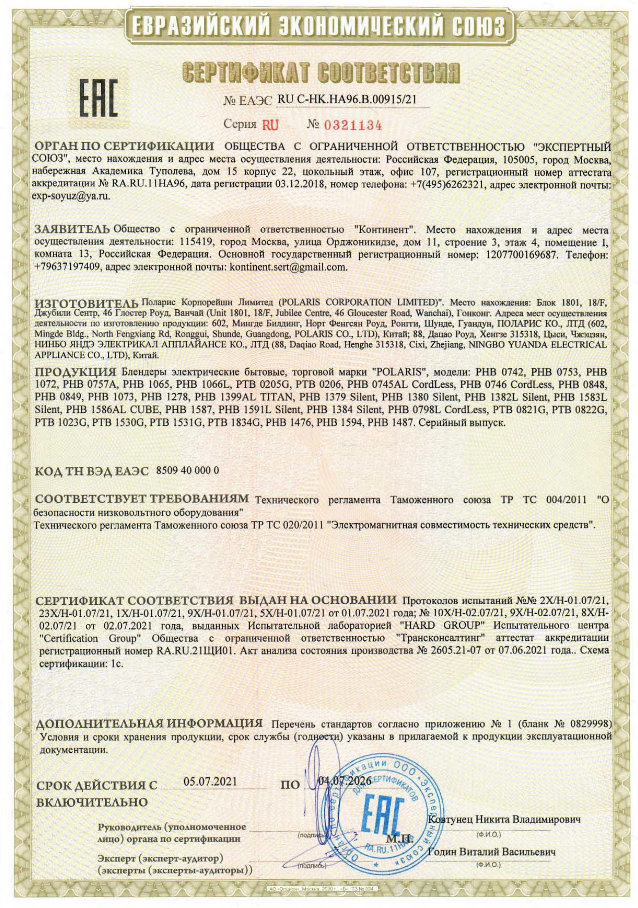 Доброго дня суток ! Купила 10.12.2022 г. через интернет – магазин ООО «Ситилинк» погружной блендер Polaris PHB 1379 Silent. Заявила претензии к магазину, так как были обнаружены недостатки в большом количестве. На дату продажи (10.12.2022 г.) погружного блендера Polaris PHB 1379 Silent сертификат соответствия от 05.07.2021 г. № ЕАЭС № RU С-НК.НА96.В.00915/21 Серия RU № 0321134 был не действителен – из ответа по запросу и после проверки Роспотребнадзор г. Москвы, : «В связи с недостоверностью сведений о заявителе, а именно о его наименовании и местонахождении». Ранее был импортёр ООО «Континент». Представитель ответчика предоставляет суду новый сертификат соответствия изготовленный 28.06.2023 г. на товар № ЕАЭС RU C CN/АВ29/В/01401/23. Серийный выпуск. Схема сертификации 1С., в котором указано, что испытания проходили в организации - Испытательный центр "Certification Group" ИЛ "HARD GROUP" Сертификаты соответствия, выданные на серийную продукцию, имеют чёткий срок действия, который максимально может составлять 5 лет. Прошу ответить, относится ли новый сертификат соответствия № ЕАЭС RU C CN/АВ29/В/01401/23 изготовленный 28.06.2023 г. к погружному блендеру Polaris PHB 1379 Silent с серийным номером изделия блендера - 02948002101593002783 ? Выпуск изделия 08.2022 г. ? (Новая серийная партия товара с новыми испытаниями от 27.06.2023 г.). 10.06.2024 г. С уважением, Талзи Галина Николаевна Ответьте пожалуйста мне на электронную почту: galina58.galya@mail.ru