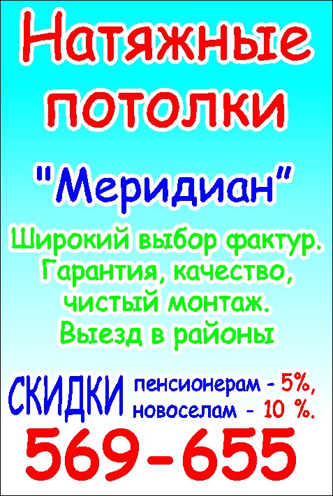 Компания ООО Меридиан из Сыктывкара предлагает клиентам товары и услуги в 4 сферах, в том числе Ремонт и отделка помещений, Натяжные потолки, Укладка напольных покрытий. Располагается по адресу Интернациональная, 157 в Сыктывкаре. Связаться с представителем компании Меридиан по всем вопросам вы можете по телефонам +7 (8212) 569655, +7 (904) 2343906, в социальной сети .